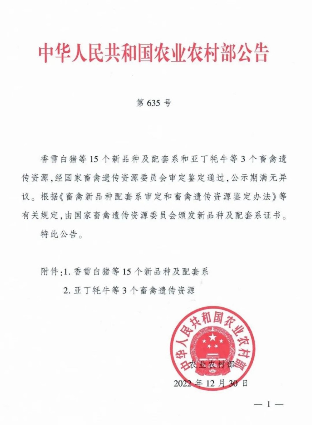 2022年12月30日,農業部發布了第635號公告:香雪白豬等15個新品種及配套系和3個畜禽遺傳資源,經國家畜禽遺傳資源委員會審定鑒定通過!